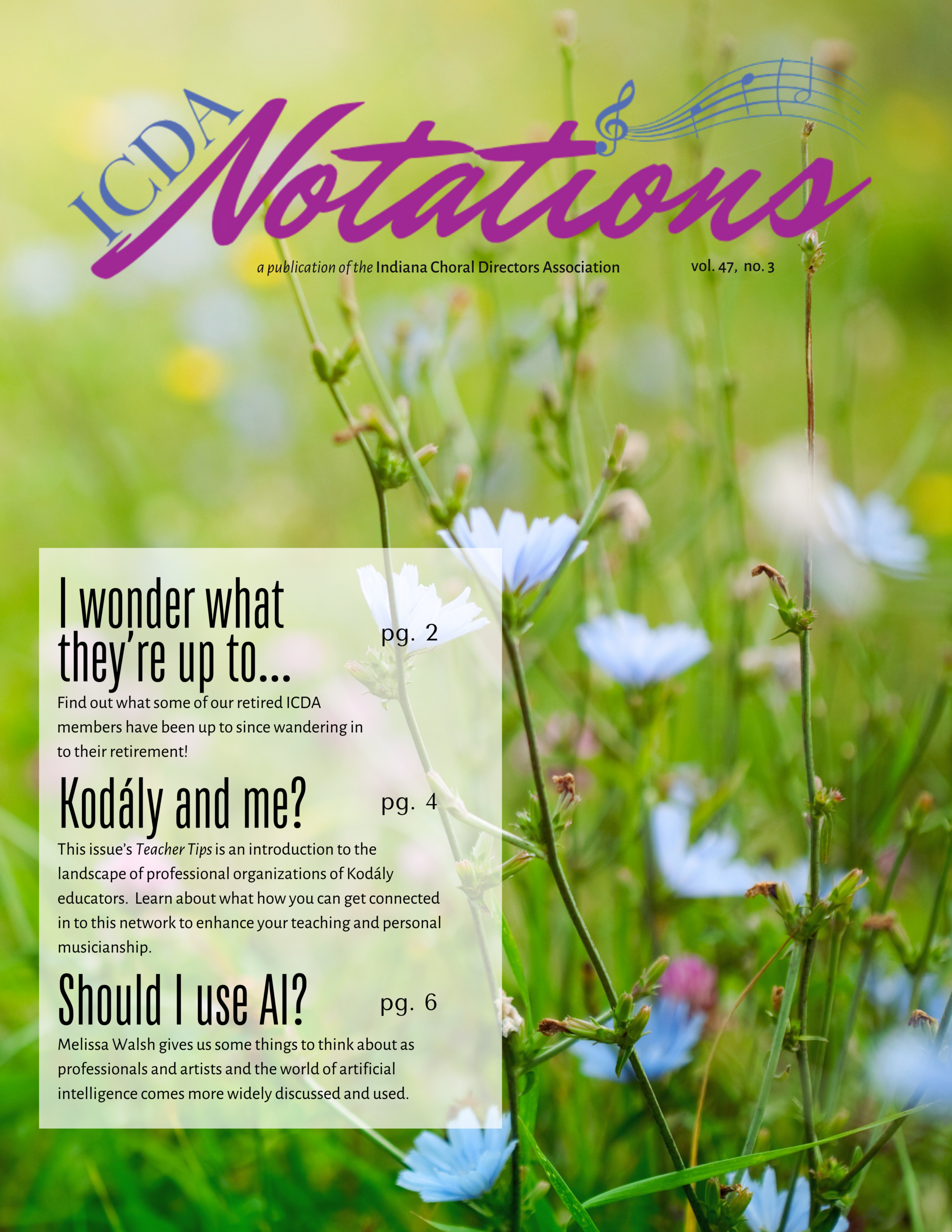 Residents of Indiana who join ACDA also become members of the Indiana chapter, the Indiana Choral Directors Association (ICDA). All Indiana members receive copies of the Choral Journal (the ACDA national magazine) and Notations (Indiana’s newsletter). To join ACDA or renew your membership, click on the ACDA link below and follow the Membership tab.